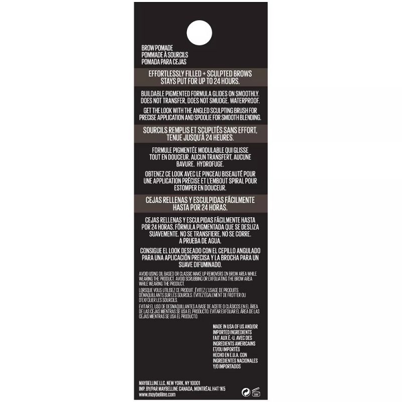 Achieve the look of full, sculpted, and natural looking eyebrows in three easy steps: outline, fill in with buildable coverage, and blend. It’s designed to perfectly match your brow color and is formulated for long-lasting, waterproof wear. Maybelline’s matte brow pomade glides on for an evenly filled in effect. The dual-ended applicator gives you the ultimate control with its angled sculpting brush and spoolie for natural shading and blending. This long-lasting formula does not smudge and does not transfer for fool-proof wear that lasts for 24 hours.
